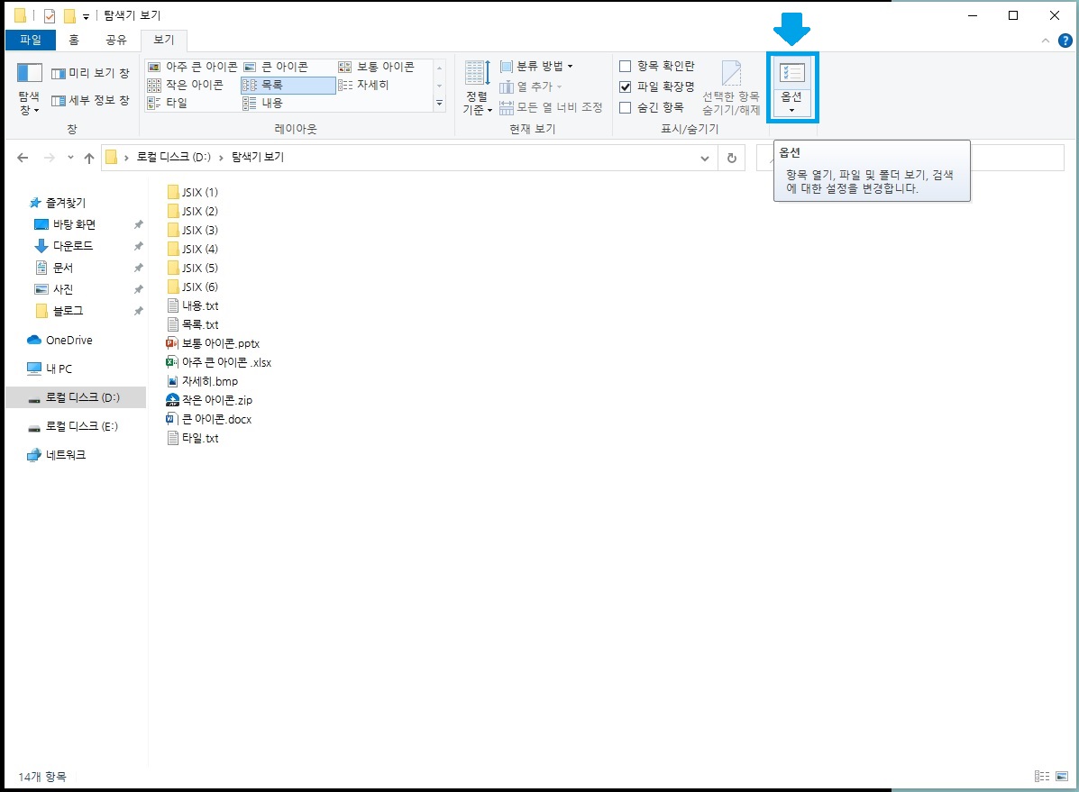 만약 다른 모든 폴더에서도 같은 보기 형식을 설정하고 싶다면 탐색기 오른쪽 위에 있는 <옵션>을 클릭합니다.