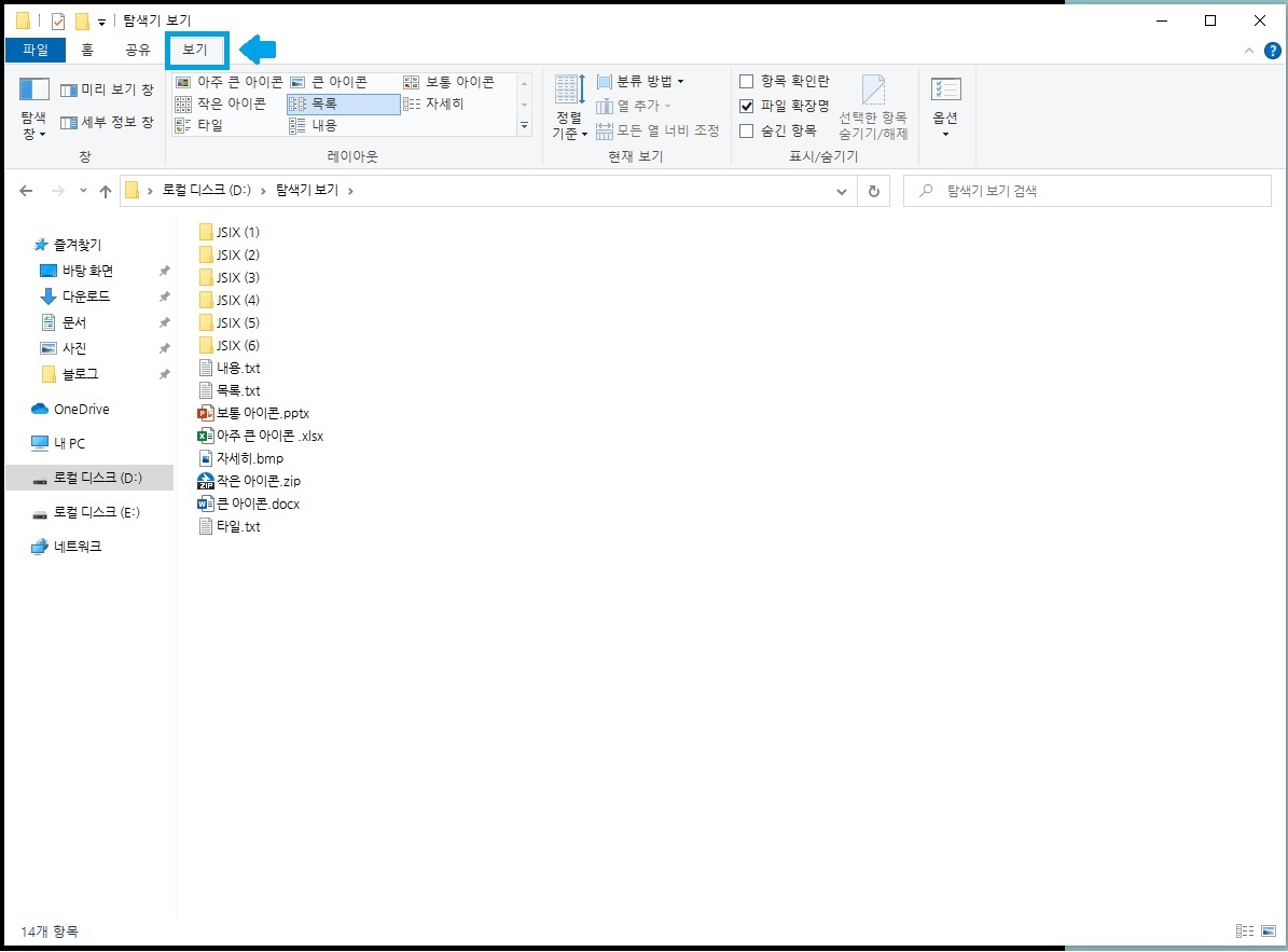 윈도우10 탐색기 보기 탭을 클릭하면 여러 가지 보기 형식을 선택할 수 있습니다.