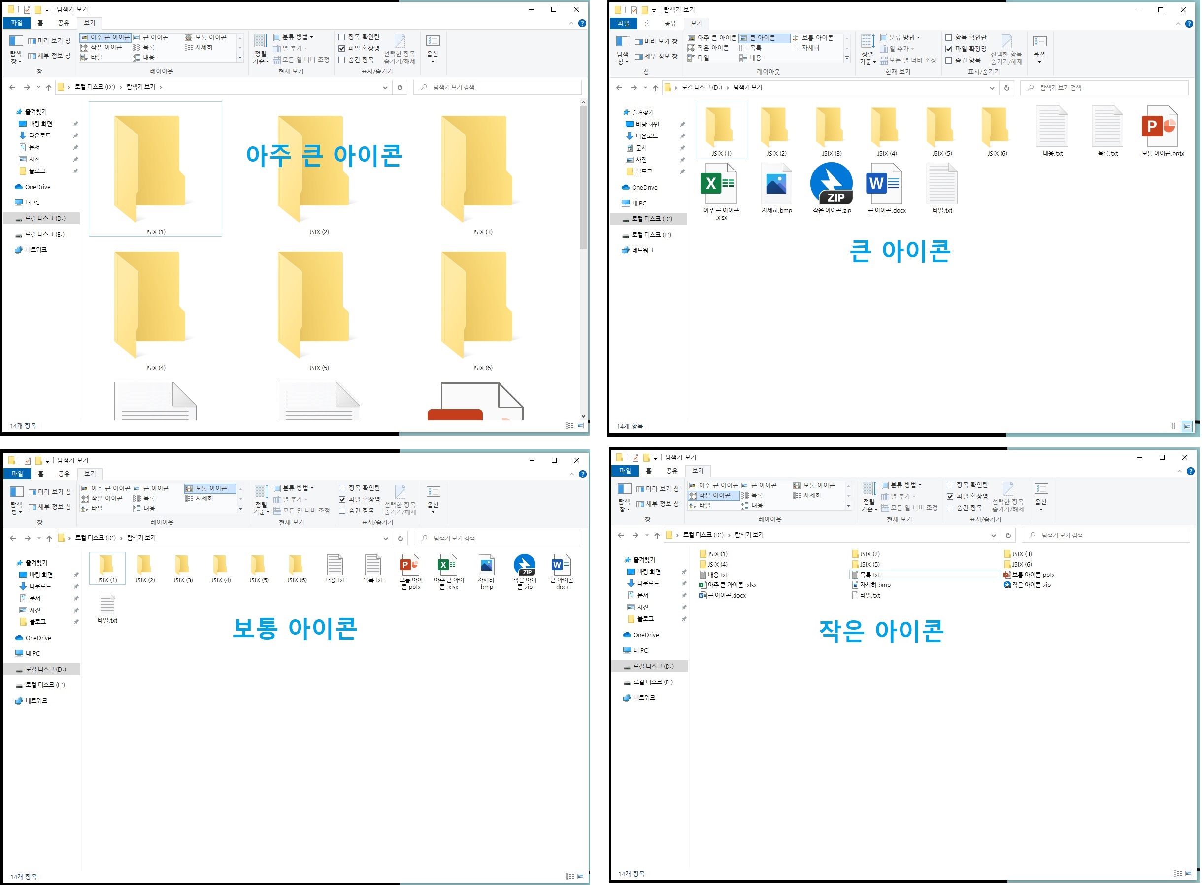 아주 큰 아이콘, 큰 아이콘, 보통 아이콘, 작은 아이콘, 목록(=간단히), 자세히, 타일, 내용