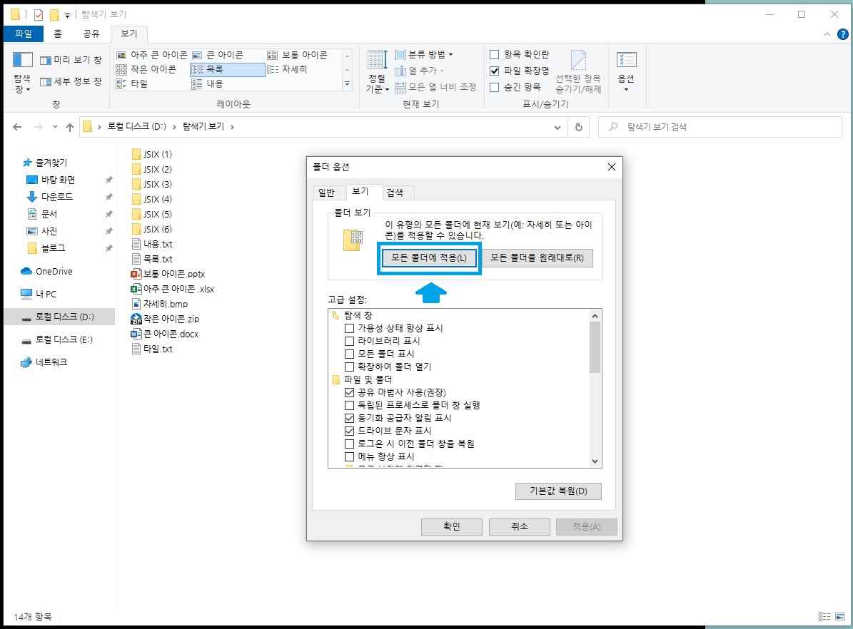폴더 옵션 - 보기 탭에서 <모든 폴더에 적용>을 클릭합니다.