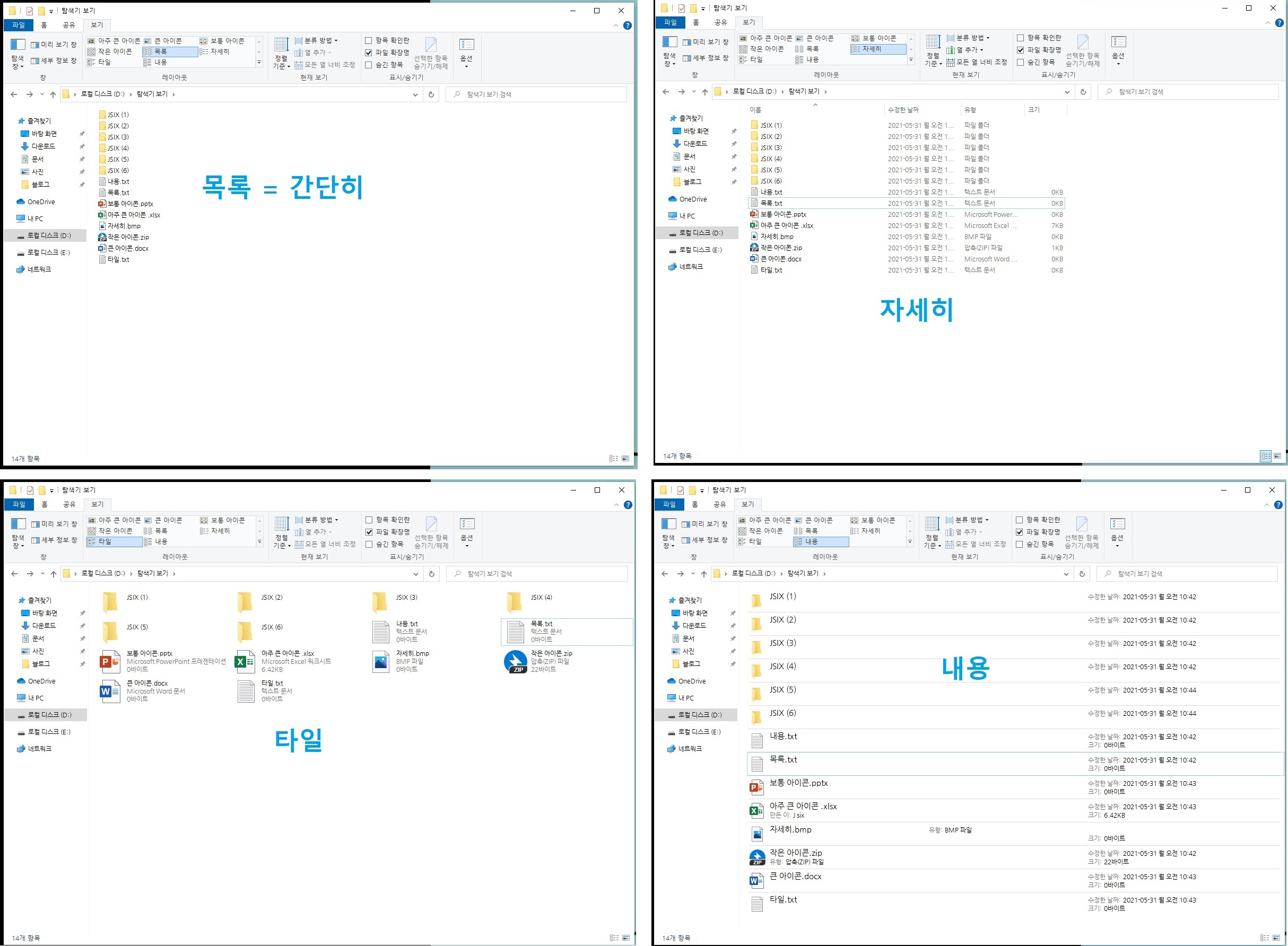 아주 큰 아이콘, 큰 아이콘, 보통 아이콘, 작은 아이콘, 목록(=간단히), 자세히, 타일, 내용